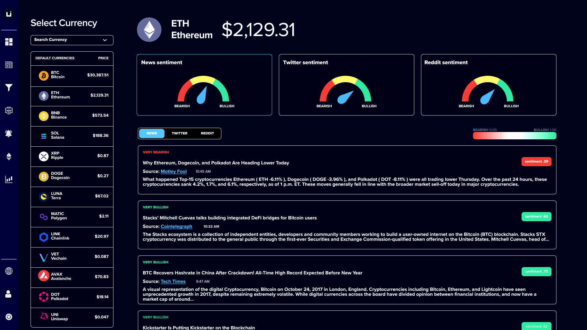 Select a digital asset from the left panel to display its aggregated news, Twitter, and Reddit feeds.<br>